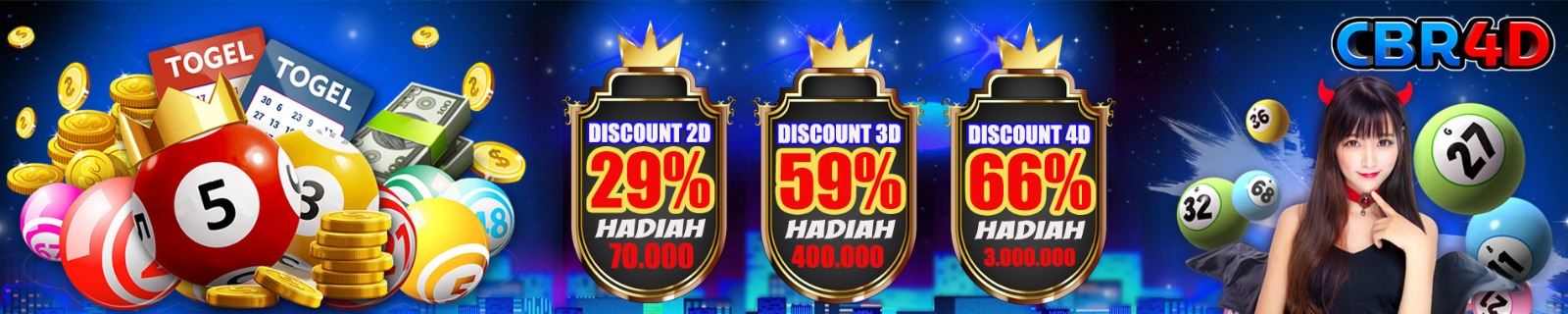 Selamat datang di CBR4D situs judi agen togel terpercaya online yang saat ini paling menguntungkan di Indonesia lengkap dengan berbagai pasaran-pasaran yang dijamin aman dan terpercaya. Para pemain bisa memilih langsung berbagai jenis pasaran yang kini sudah kami sediakan, mulai dari pasaran Hongkong, Singapore, Sydney dan masih banyak lagi. CBR4D juga saat ini sudah menyediakan taruhan togel online 2D, 3D sampai 4D yang bebas dipilih dan dimainkan. Dengan fasilitas dan pelayanan yang nantinya akan kami berikan dan ditambah dengan beberapa bonus dan penawaran menarik lainnya. Dipastikan para pemain bisa dengan mudahnya mendapatkan keuntungan yang berlimpah dengan sangat mudahnya. Tidak hanya situs togel saja, CBR4D juga kini telah menyiapkan taruhan slot online yang dilengkapi dengan puluhan sampai ratusan game yang bermacam-macam. Dari sekian banyaknya permainan yang telah disediakan, pemain bisa memilih dan mulai bermain hanya dengan menggunakan satu akun tanpa harus repot mengganti akun. Sebagai situs judi slot online yang terpercaya, CBR4D kini juga telah bekerjasama dengan beberapa provider. Yakni diantaranya ada Habanero, Spade Gaming, Pragmatic Play, Joker Gaming sampai Top Trend Gaming. Dengan adanya layanan customer service alias live chat yang kini sudah kami sediakan. Para pemain juga akan mendapatkan arahan dan panduan langsung dari customer service situs CBR4D.